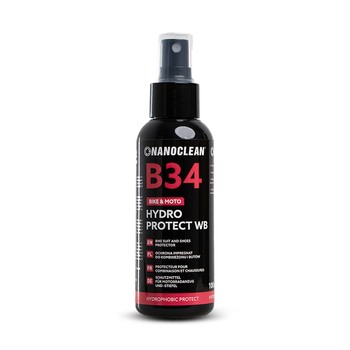B34 HYDROP PROTECT WB to przezroczysty, ekologiczny, wodny preparat ochronny, który tworzy oddychającą, niewidzialną barierę przeciw wodzie, brudowi i promieniom UV. Bezpieczny dla skóry, tkanin i materiałów syntetycznych, zapobiega przemoczeniu, osadzaniu się zabrudzeń i blaknięciu materiału, nie pozostawiając przy tym śladów ani nie zmieniając struktury tkaniny. Idealny po praniu kurtek, kombinezonów, rękawic, butów oraz części motocykla.