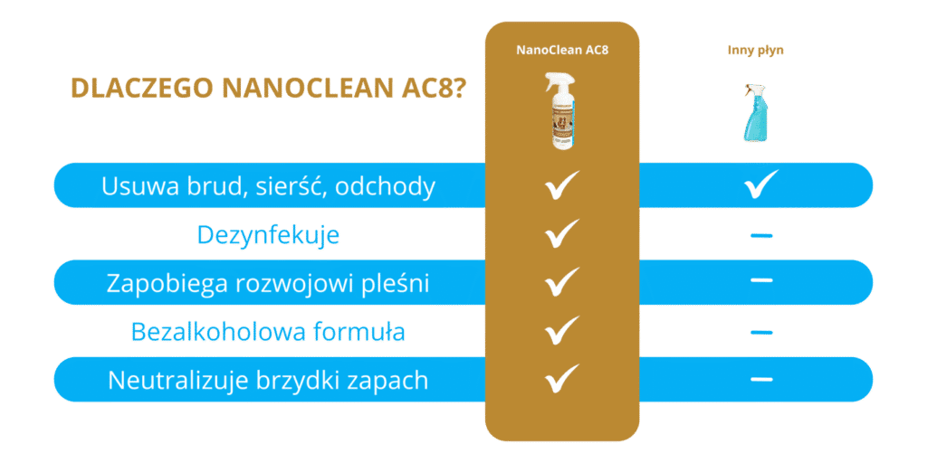 Uwaga: NANOCLEAN AC8 również sprawdza się w przypadkach awaryjnych. Natychmiastowo usuwa wszelkie przykre zapachy, czyści i dezynfekuje, gdy przestrzeń małych zwierząt została zanieczyszczona pleśnią lub innymi organicznymi zabrudzeniami.